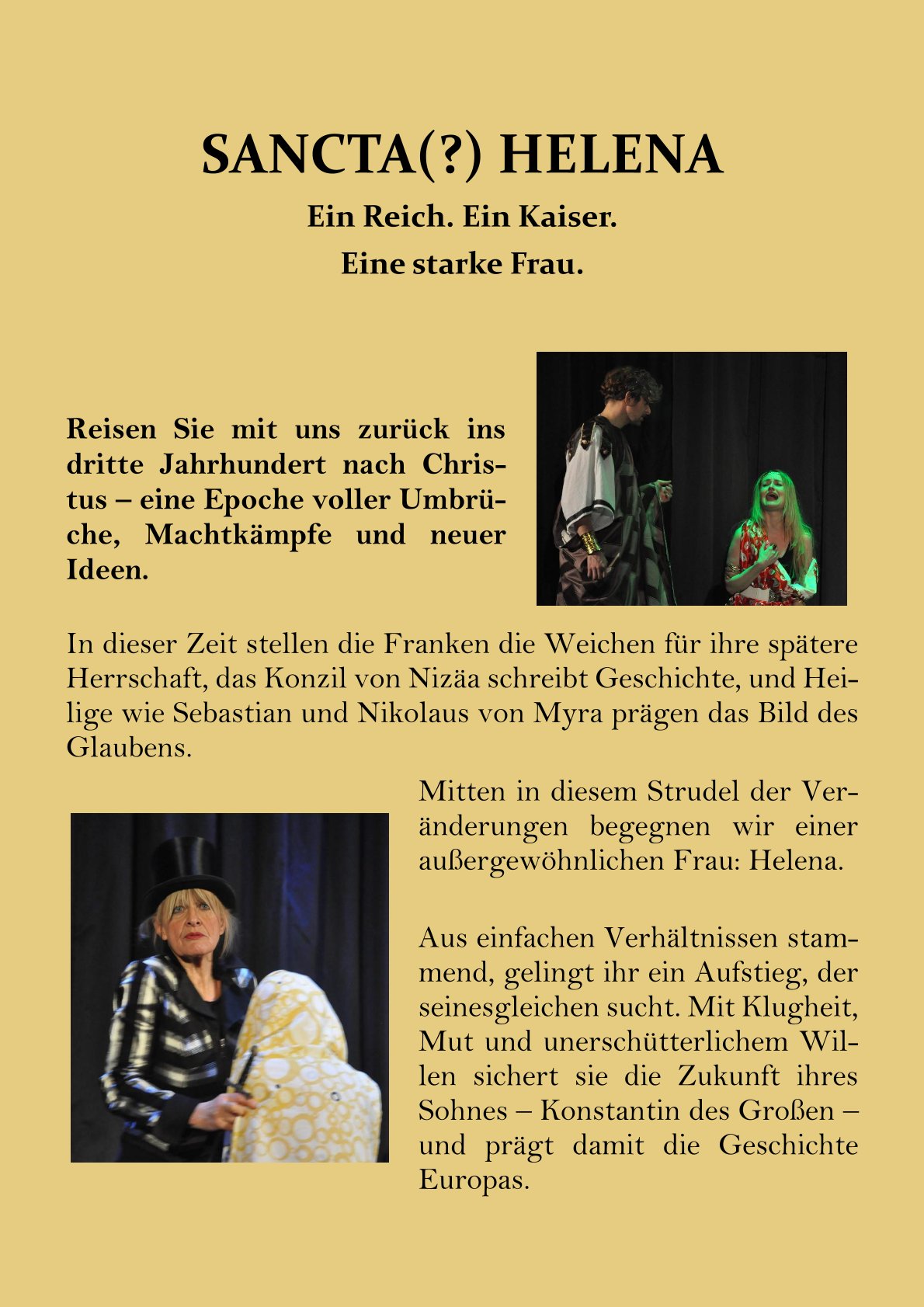 SANCTA(?) HELENA ist eine kritische Auseinandersetzung mit der Biografie einer Heiligen und eine Mut-Mach-Geschichte, die zu Herzen geht, aber auch humorvolle Seiten hat. Es ist die Geschichte einer Frau, die sich von Rückschlägen nicht einschüchtern lässt und beharrlich ihren Weg geht.